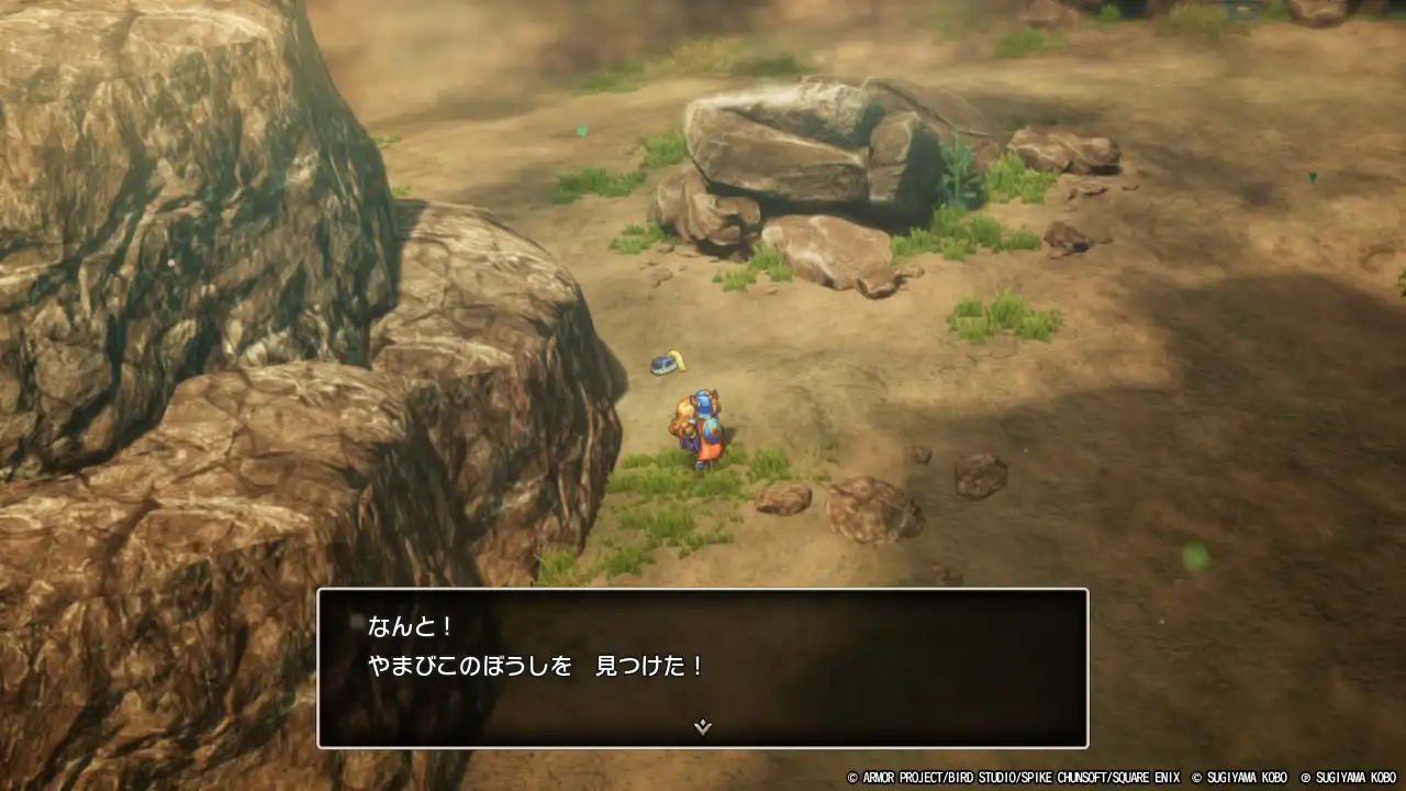 - [B] 街道の宿屋から南東にある秘密の場所に、緑宝箱「ミラーシールド」。さらに南西の岩の横、草むらに「やまびこのぼうし」(参考画像)