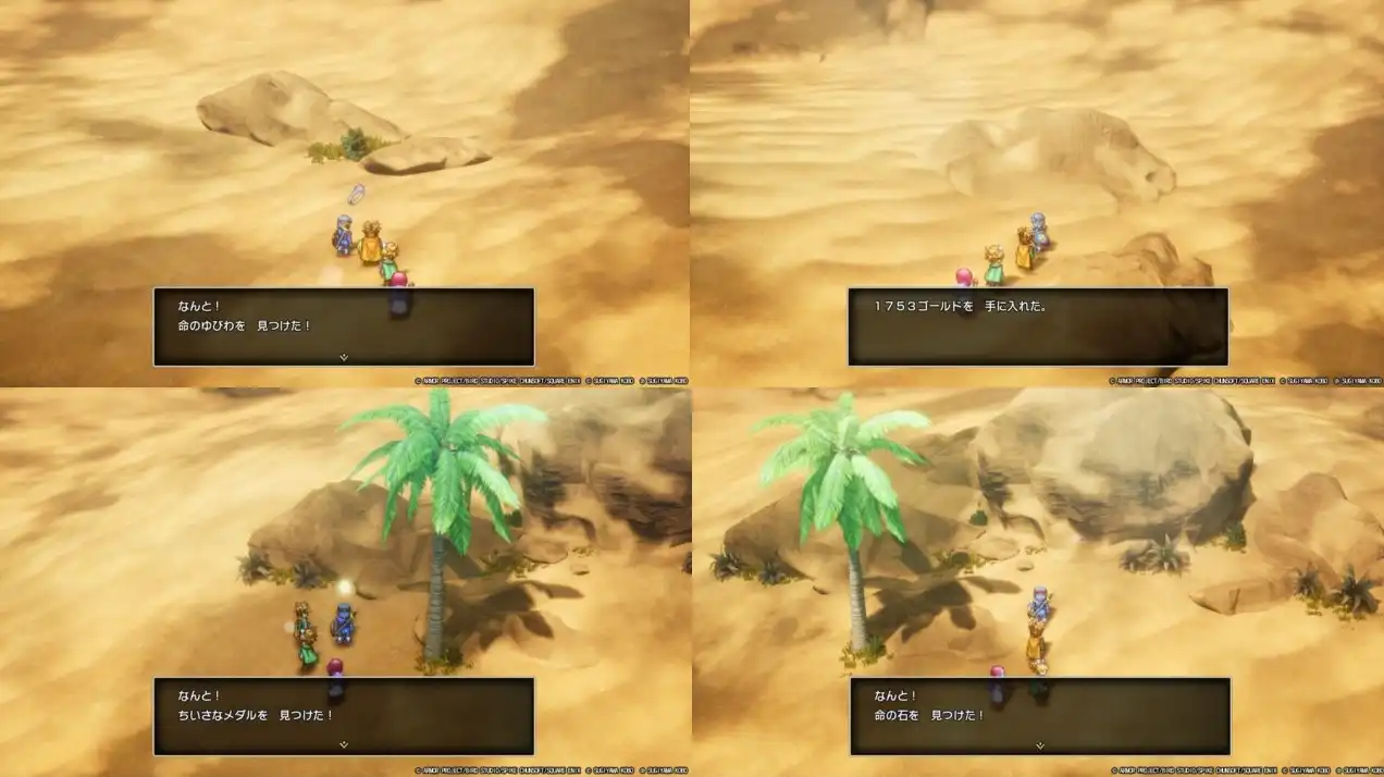 - [A] 秘密の場所。中央大岩前「命の石」、ヤシの木の西側「ちいさなメダル」、北西地面「命のゆびわ」、北東地面「1753ゴールド」(参考画像)