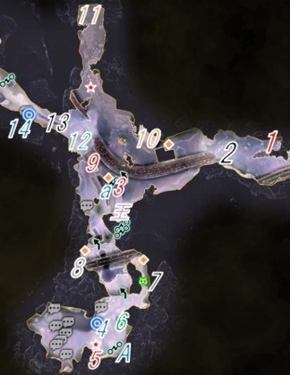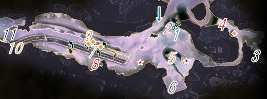 神意覚醒:「刹那の会話」「火炎の心得・参」「氷結の心得・参」「電撃の心得・参」「衝撃の心得・参」「変質因子」 - 上層道路の西側、登はんポイントの上に白い宝箱(御厳80)
