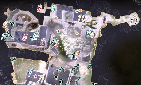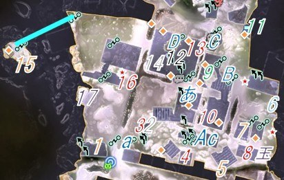 - [あ]の位置にある建物を登り、登はんポイントから屋上へ。そこから南西に屋上を飛び移っていくと白い宝箱(御厳80)