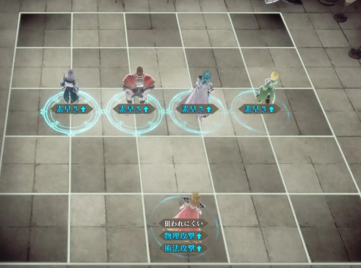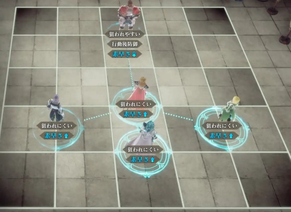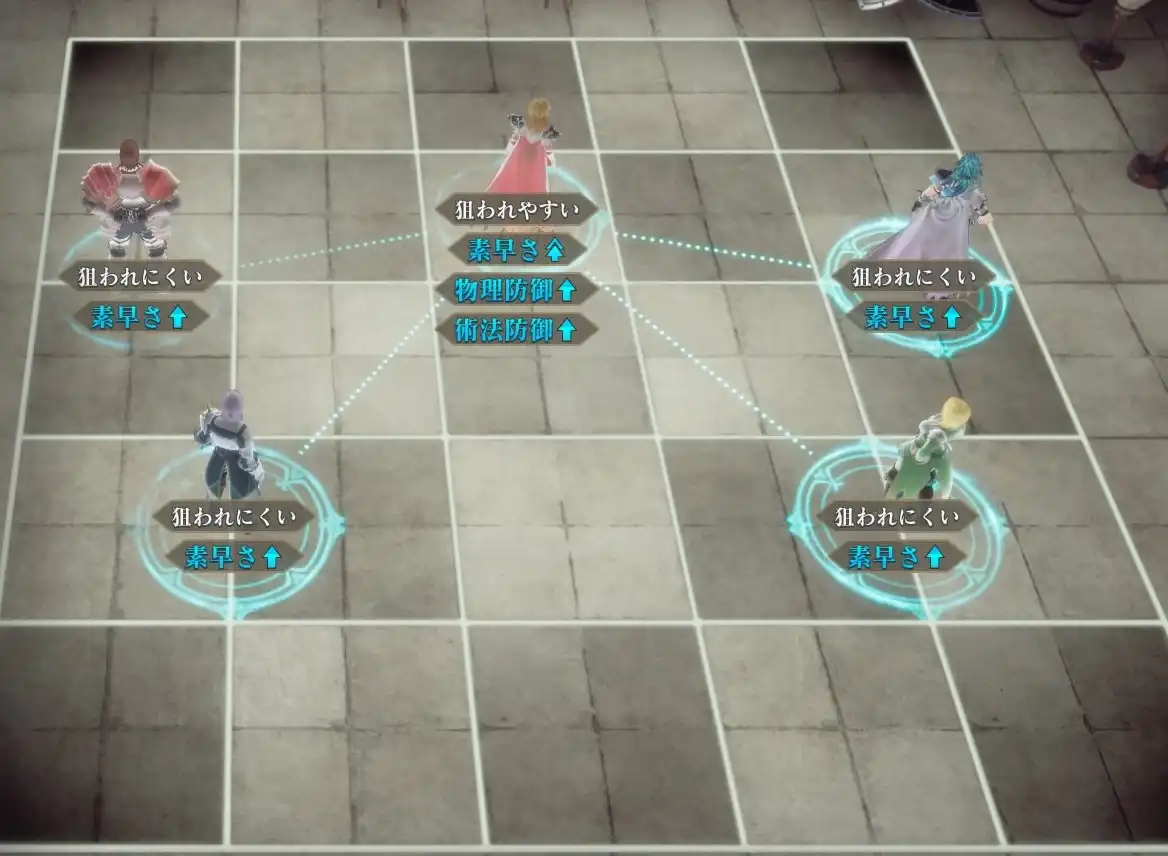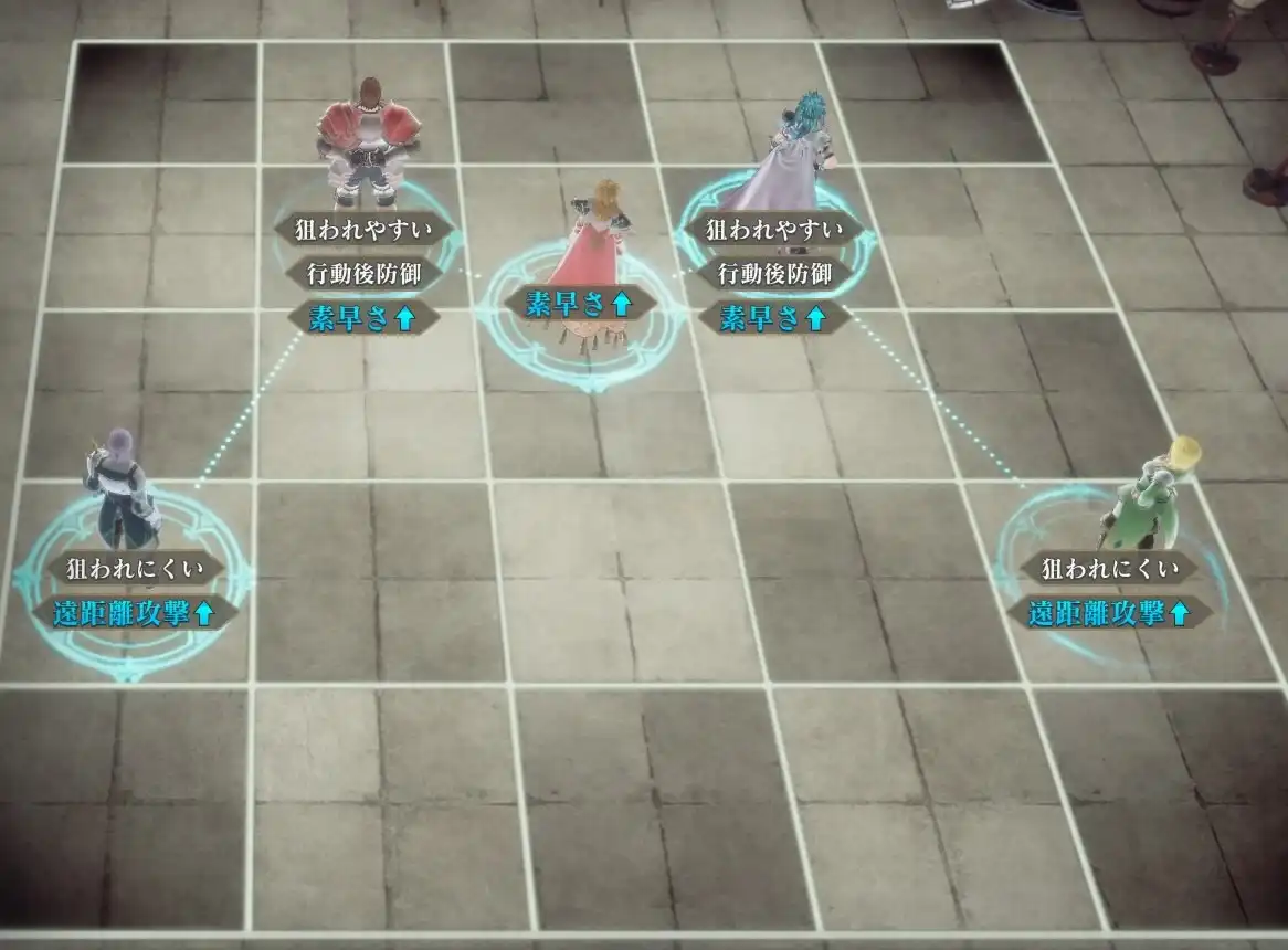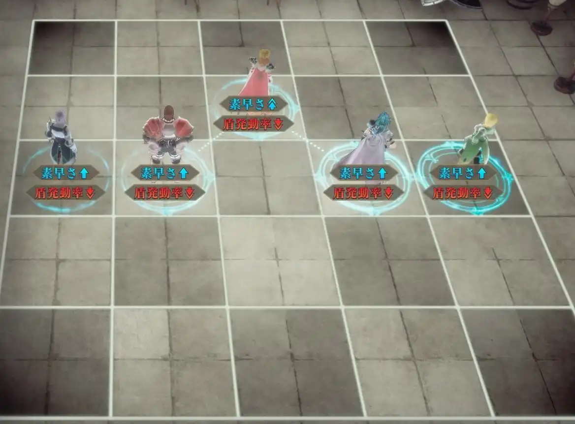 チャームドライブ | 踊り子に魅了されるように中央に視線を集める陣形。中央の者に呼応する形で全員の素早さを強化する。