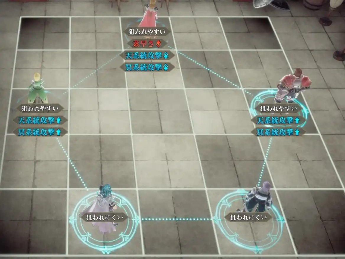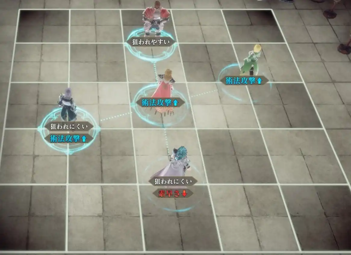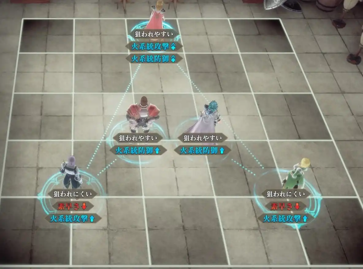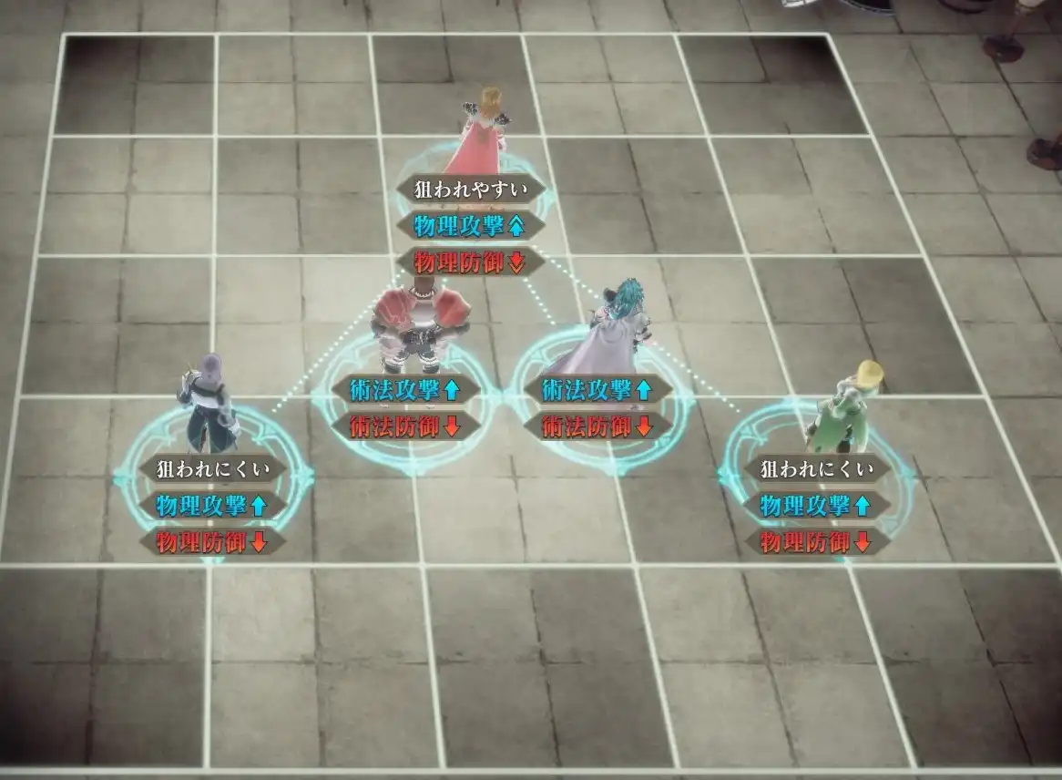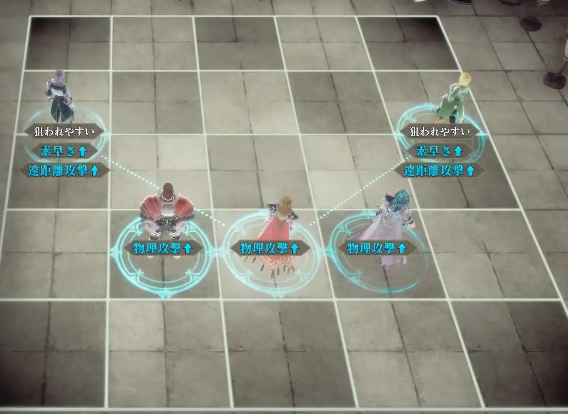 チャームドライブ | 踊り子に魅了されるように中央に視線を集める陣形。中央の者に呼応する形で全員の素早さを強化する。