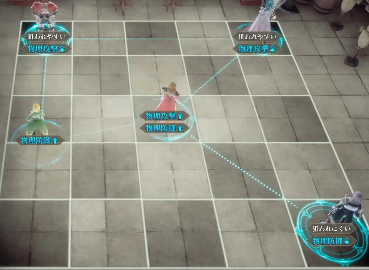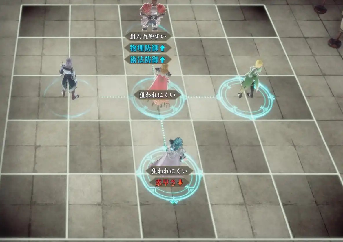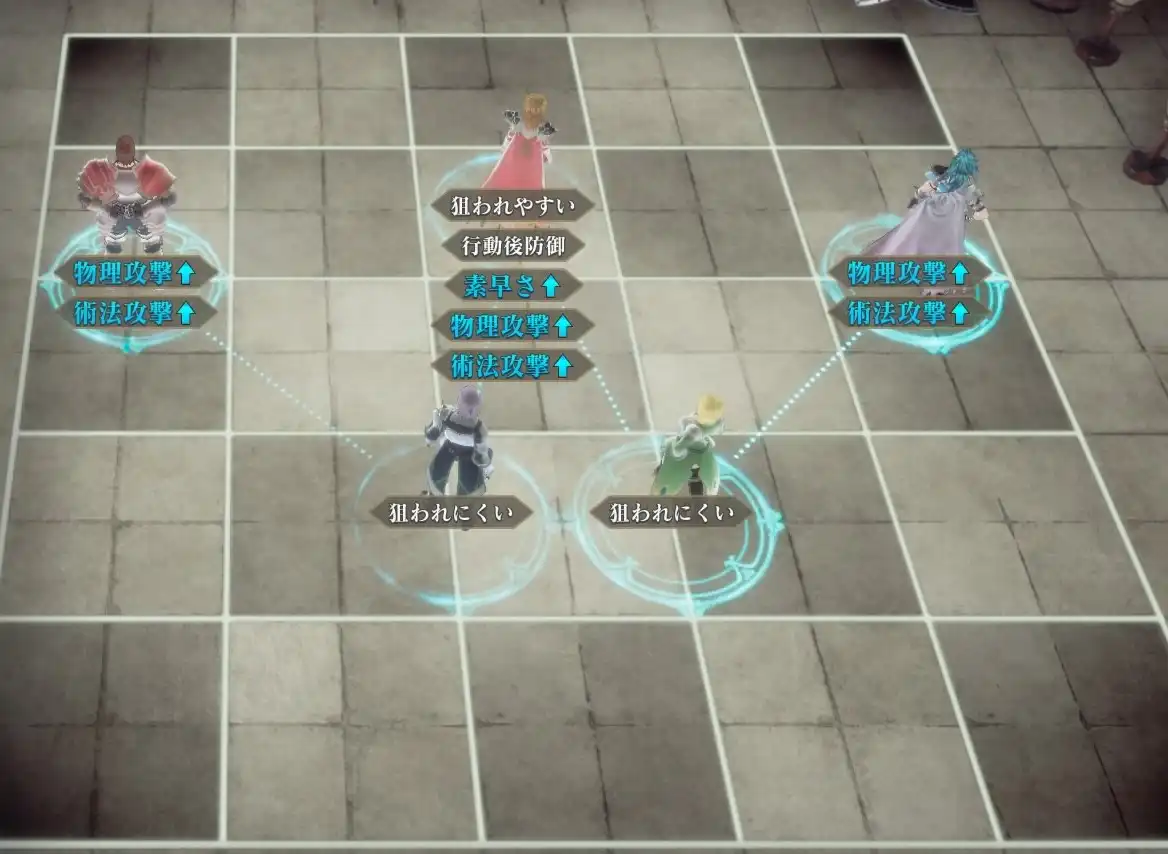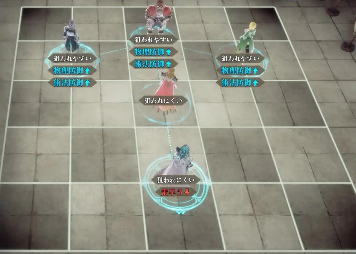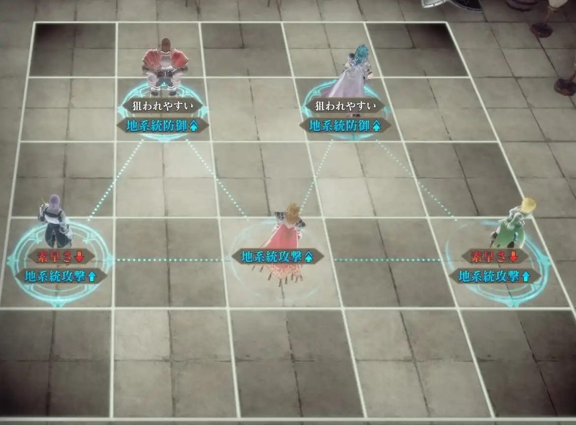 チャームドライブ | 踊り子に魅了されるように中央に視線を集める陣形。中央の者に呼応する形で全員の素早さを強化する。