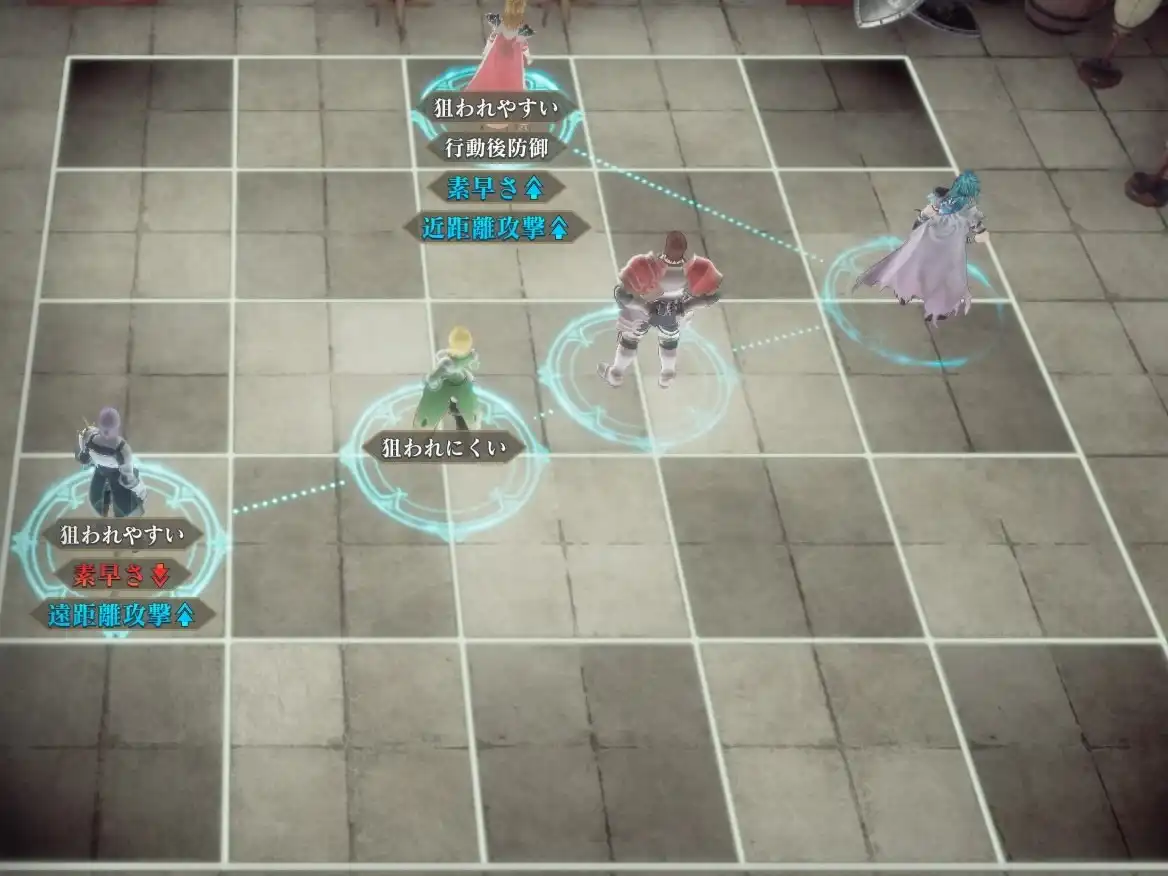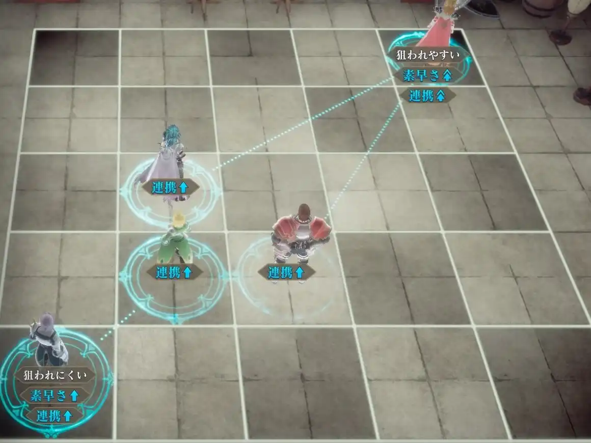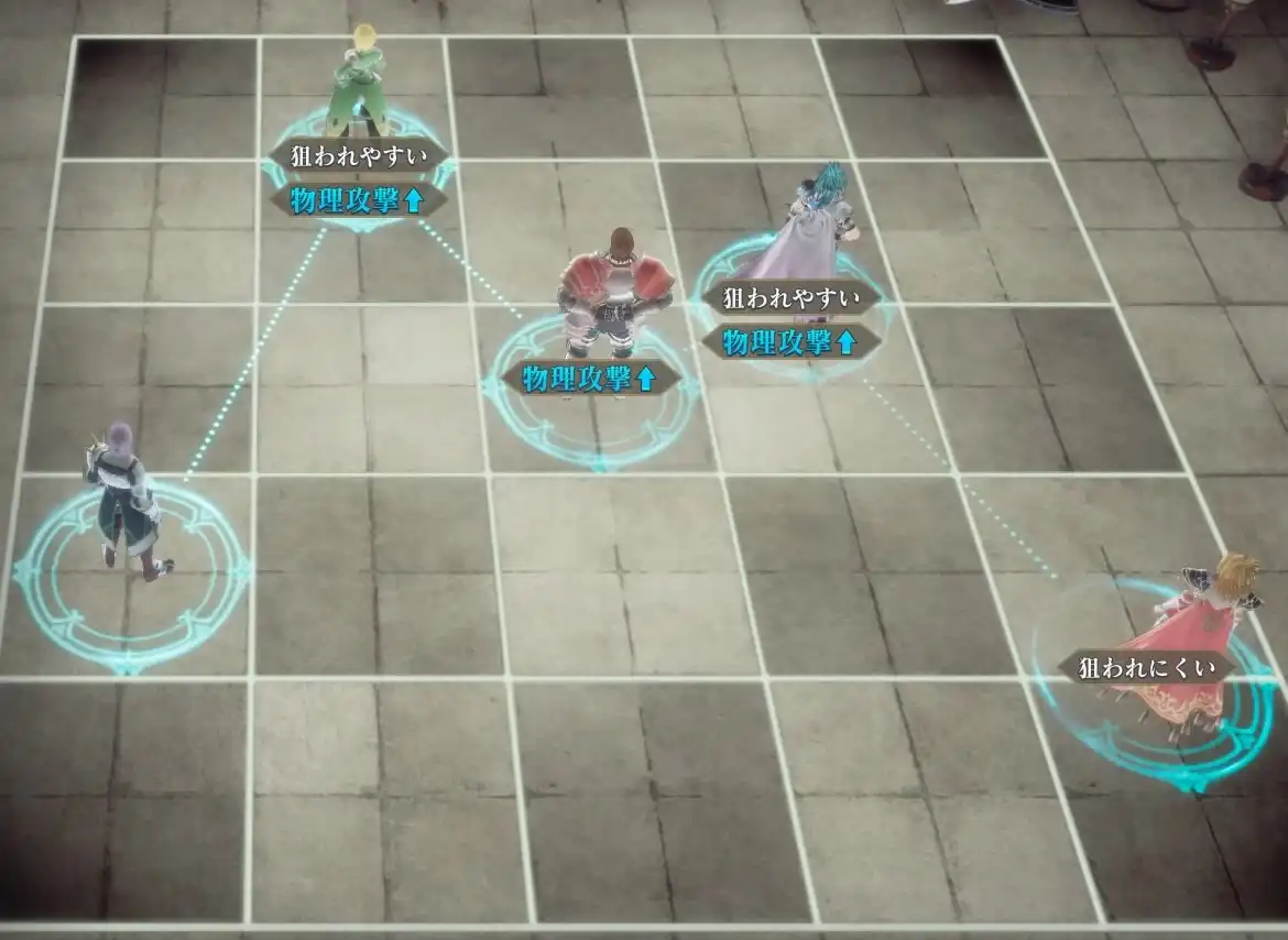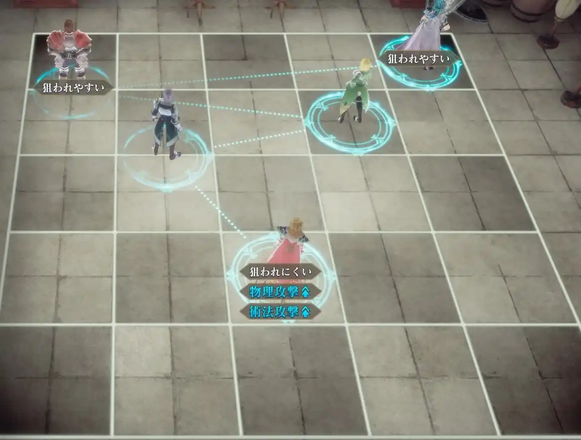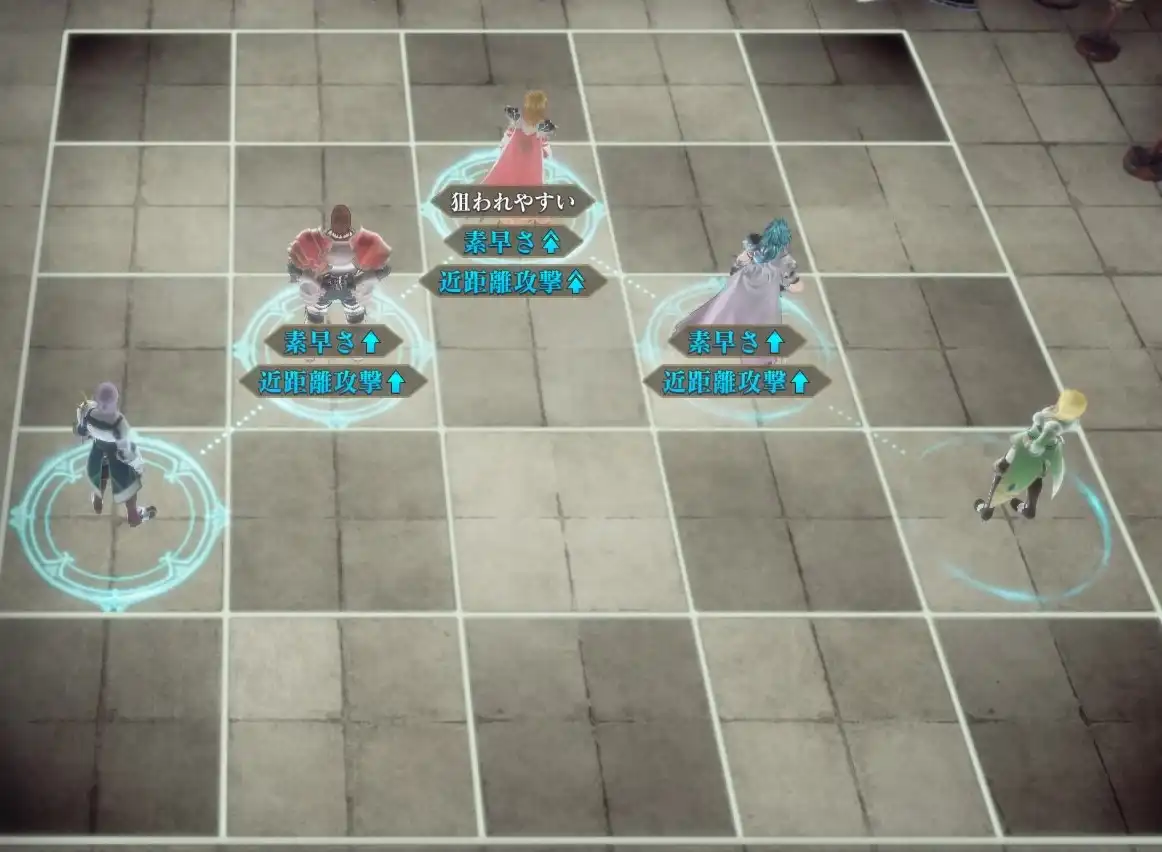 チャームドライブ | 踊り子に魅了されるように中央に視線を集める陣形。中央の者に呼応する形で全員の素早さを強化する。