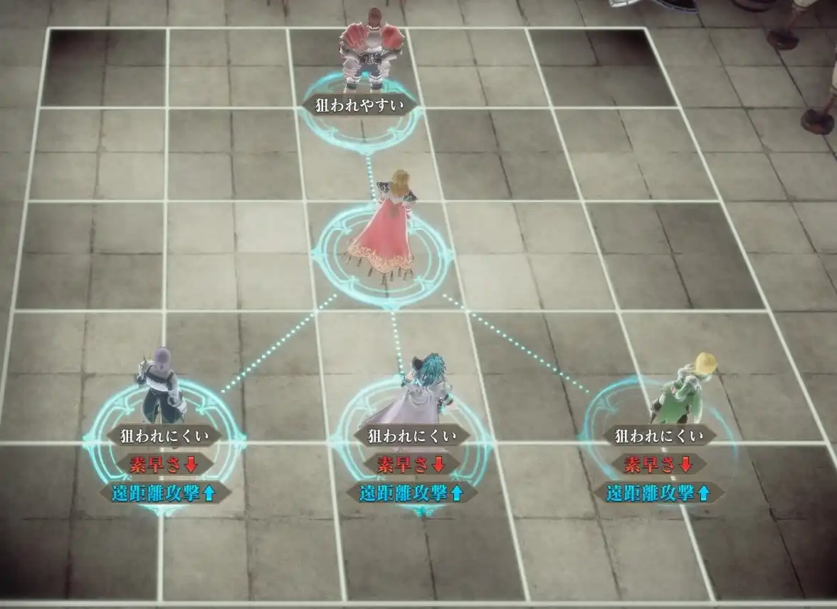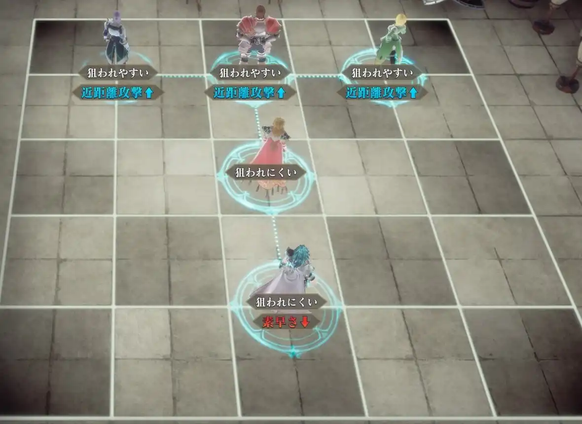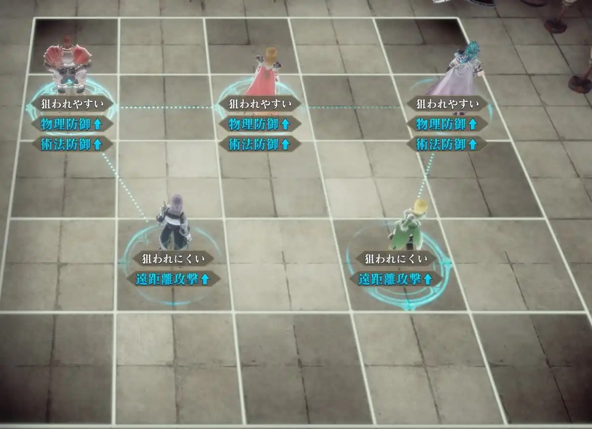 インペリアルレイ | 敵の防御を崩すように尖った形を取る陣形。前列に攻撃を引き付け、後列の遠距離攻撃を強化する。