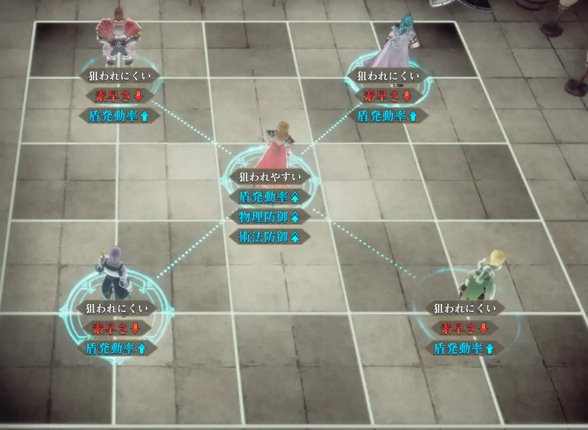 鳳天舞の陣 | 中央の者に敵の攻撃を集中させる陣形。守りを固め、盾の発動率を上昇させる。