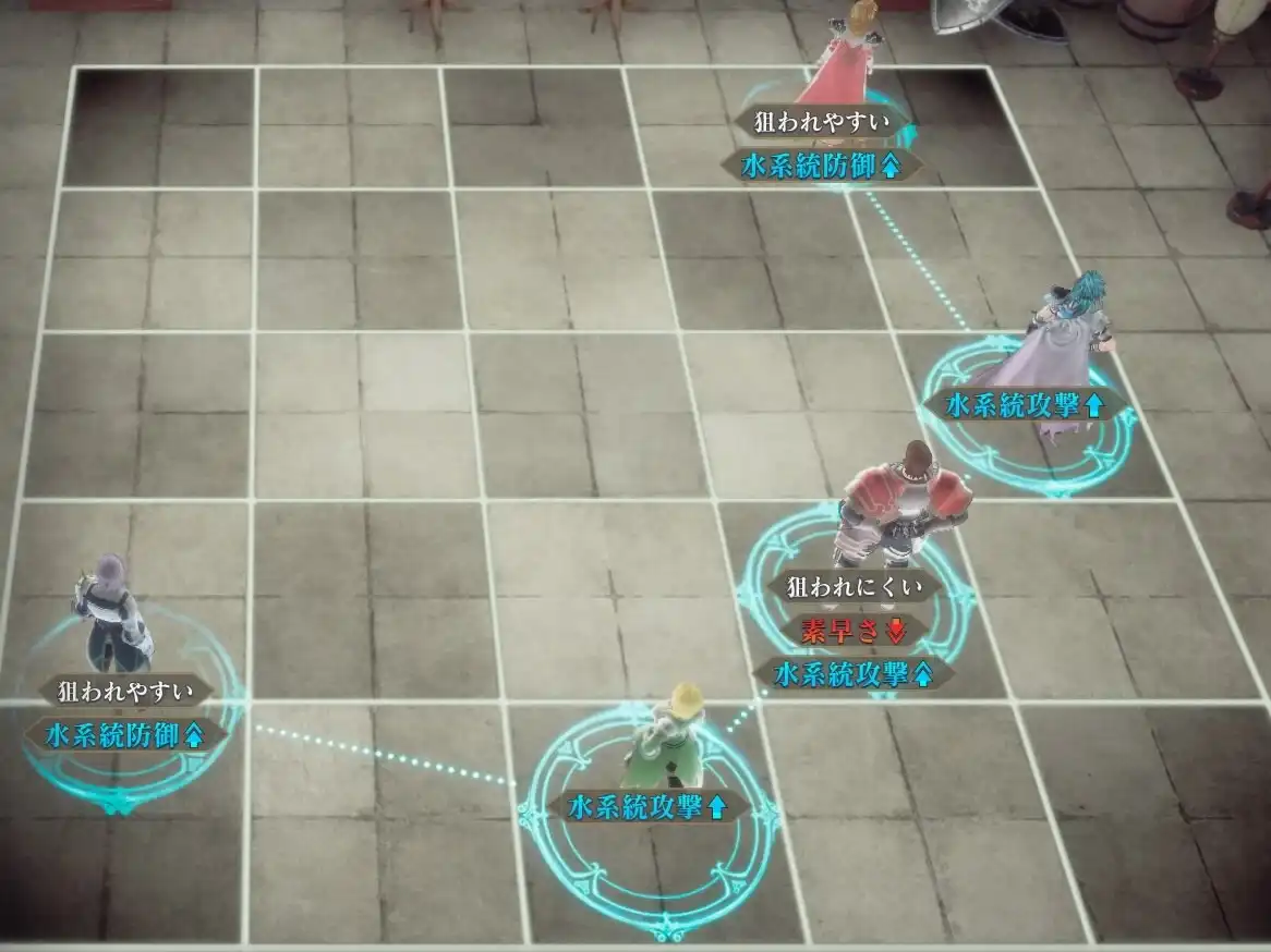 アクアムーン | 水の流れを受け流し、自分たちの力とする陣形。水系統の攻撃と防御を強化する。